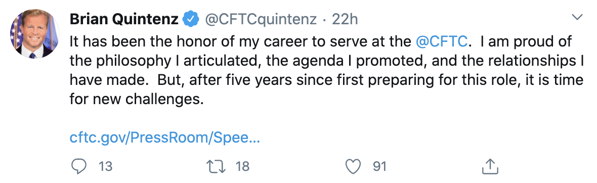 Brian Quintenz took to Twitter recently to confirm that he is stepping down from his post at the CFTC. He plans to vacate his position by October.