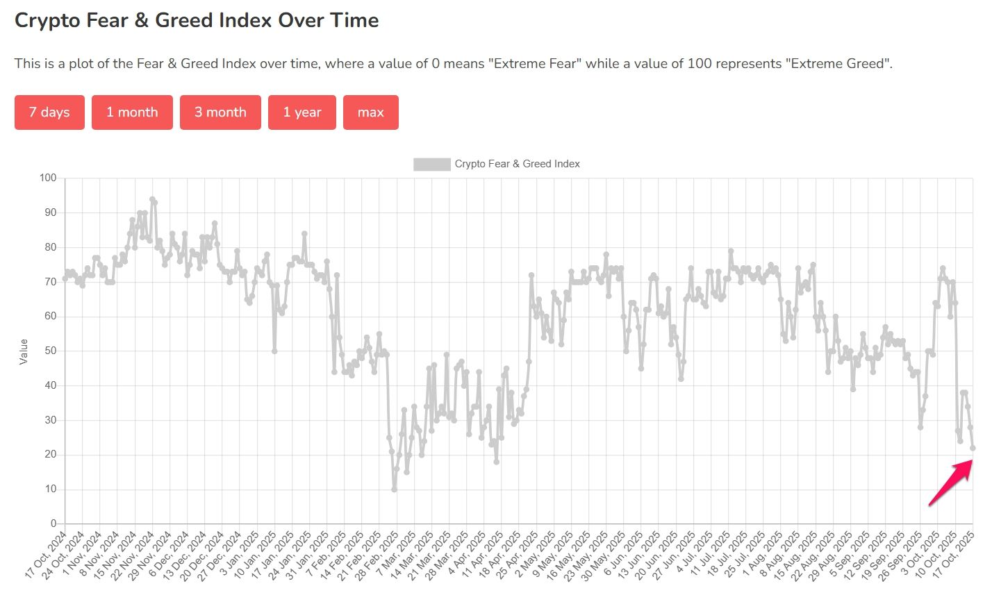 On October 17, 2025, the Crypto Fear & Greed Index plunged to 22 points, marking a state of “extreme fear” – the lowest level since April.