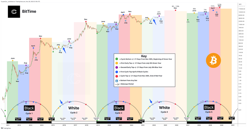 The BitTime cycling model offers additional insights into potential Bitcoin price action, says CryptoCon. This framework closely tracked the 2015-2018 timeframe during Cycle 2. Despite anomaly Cycle 3 throwing predictions off, Cycle 4 realigned with Cycle 1 targets.