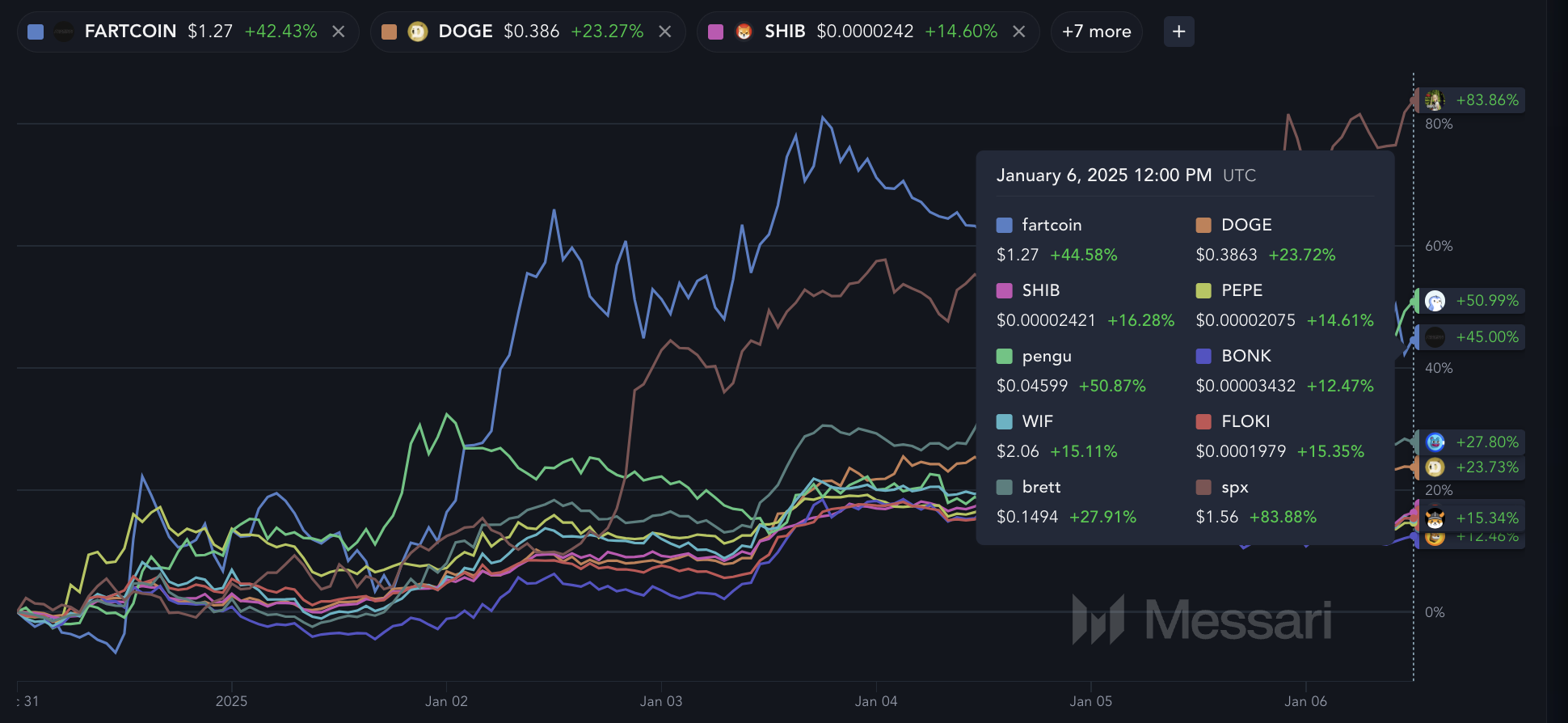 The meme coin market continues to thrive, with all of the top 10 biggest meme coins now boasting market caps exceeding $1 billion. Over the past week, each of these coins has experienced price increases, ranging from 12% to 83% in weekly gains.