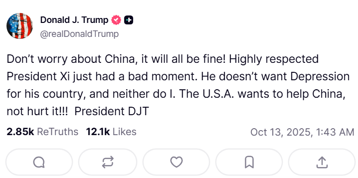 After hitting its peak, Bitcoin went through a natural correction, consolidating around the $122,000 level for most of the week. However, the market ran into trouble around 4:00 PM UTC on Friday, when President Donald Trump suddenly posted on social media about China’s restrictions on rare earth exports, calling the move “a very hostile act.”