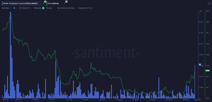 Indicatively, the MANA token attracted an unusually high number of whale demand on November 2, 2023. Remarkably, the Santiment chart below shows the 42 MANA whale transactions recorded on Thursday are the highest since June 5.