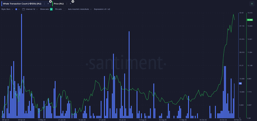 But since then, crypto whales have continued to pile on demand, allaying fears that the initial rally was a flash in the pan. In effect, Santiment data reveals INJ has attracted a consistent flow of whale transactions in the 16 days consecutively, dating back to October 18.