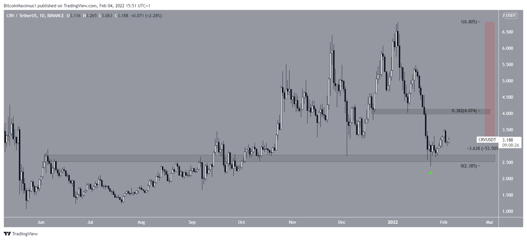 Since January 04, Curve Dao Token (CRV) has been falling since reaching an all-time high price of $6.80. The downward movement led to a low of $2.36 on January 24, where the token bounced afterwards (green icon), validating the $2.60 horizontal area as support.