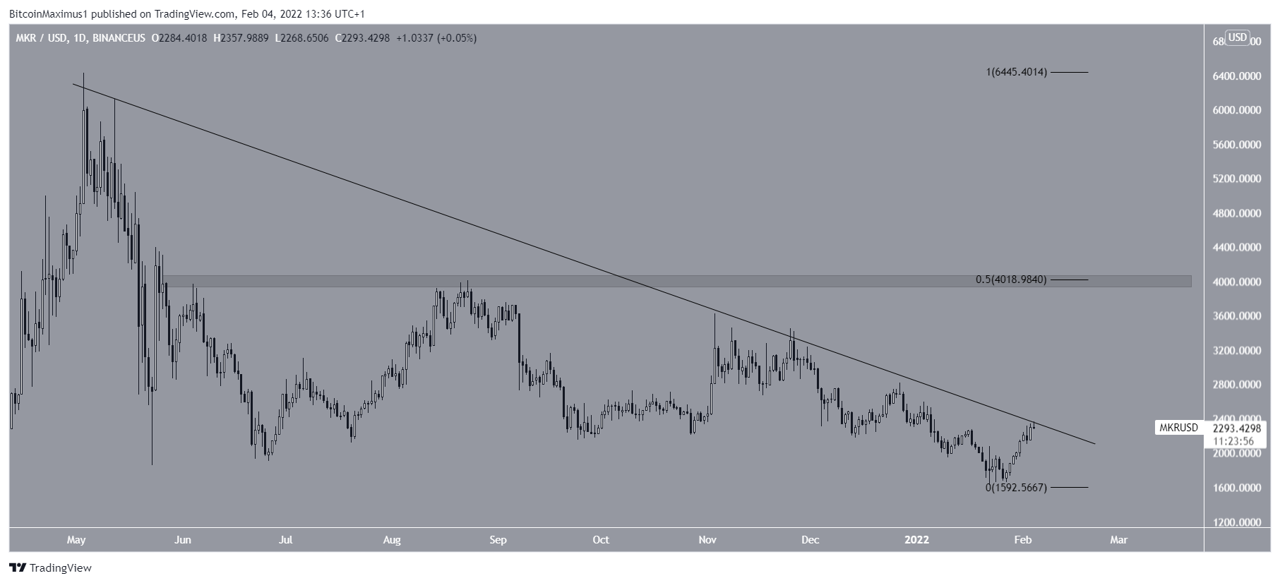 Similarly to XTZ, MKR has been following a descending resistance line since it reached an all-time high price on May 3, leading to a low of $1,620 on January 22.