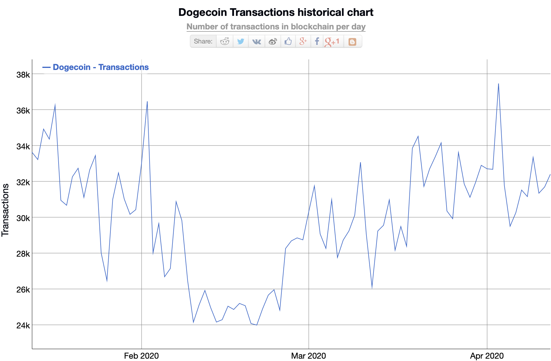 While Bitcoin saw a marked decline in daily transactions through March and April, Dogecoin actually saw a significant increase.