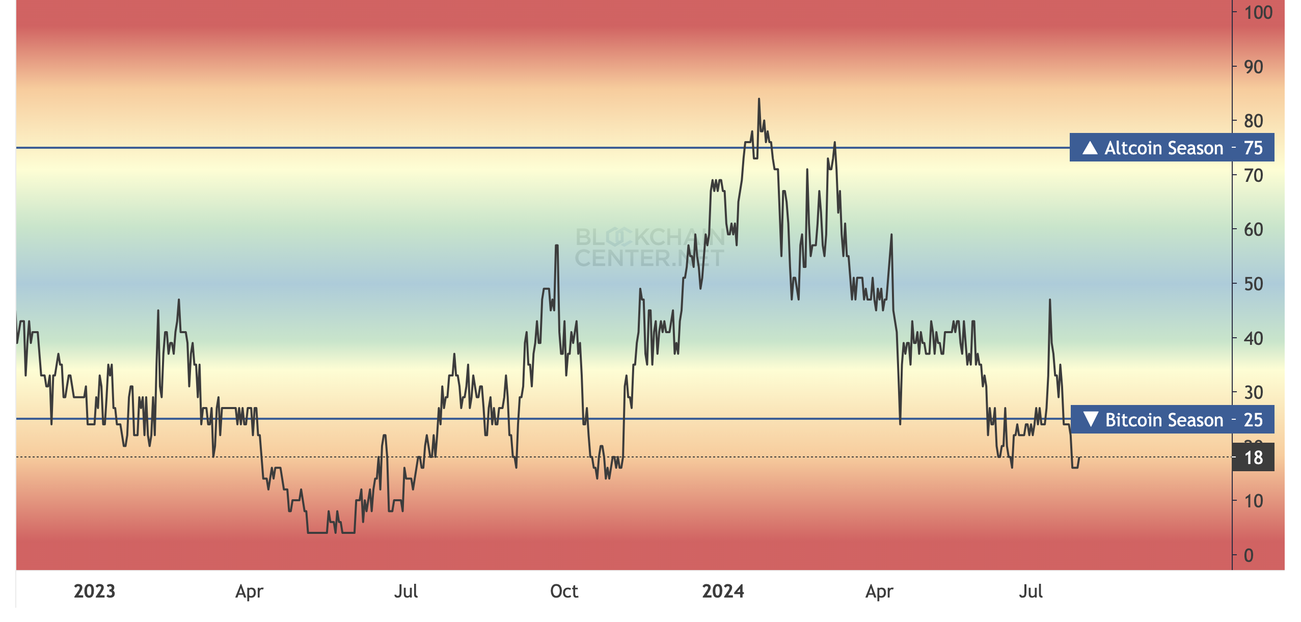 To validate the season, the index has to reach 75, implying that at least 75% of the top 50 non-Bitcoin (BTC) cryptos are outperforming the number one coin.