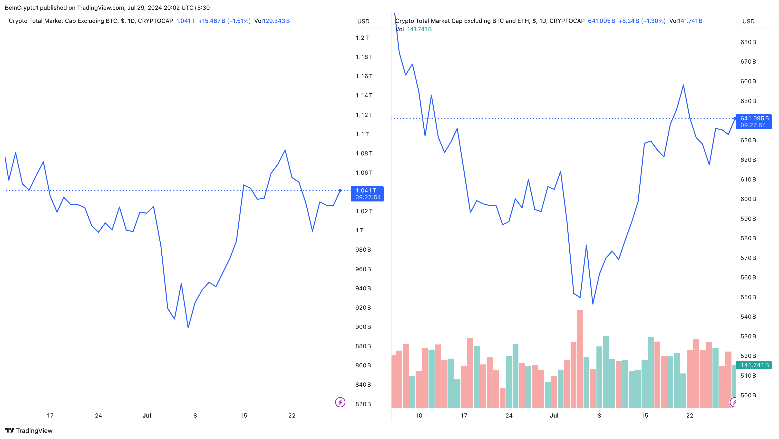 TOTAL2 is the total market cap of the 125 altcoins excluding BTC. TOTAL3, on the other hand, is the market cap of altcoins excluding ETH, as well as BTC. From the image below, we observe that the trend of both market caps is similar.