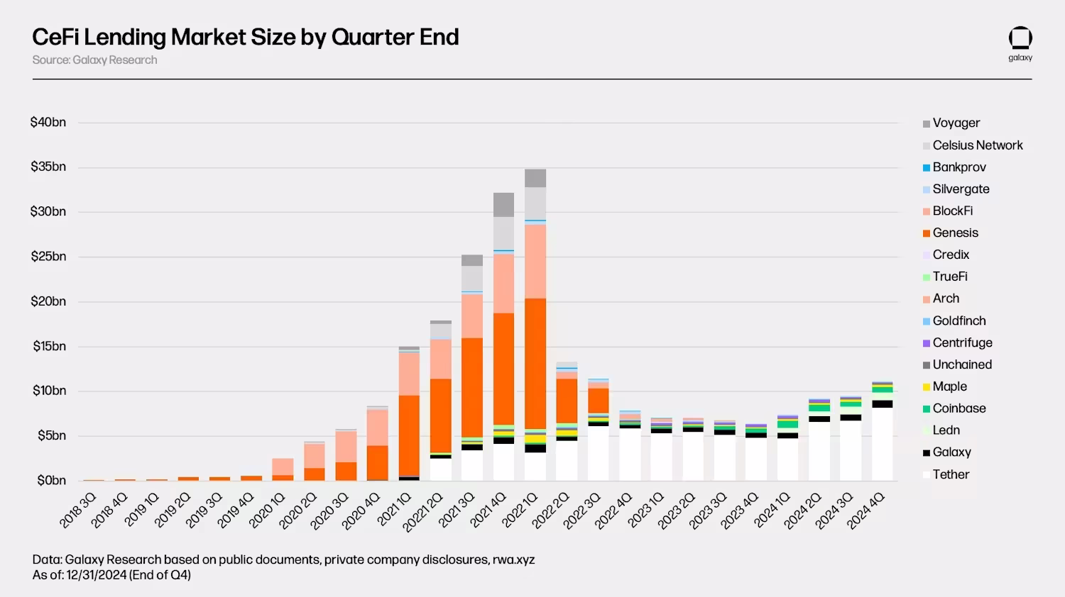 Notably, the recovery in CeFi lending is also marked by a consolidation of market share. The top three lenders—Tether, Galaxy, and Ledn—control 89% of the market as of Q4 2024. Previously, in 2022, the then-top three lenders, including Genesis, BlockFi, and Celsius, held 75% of the market share.