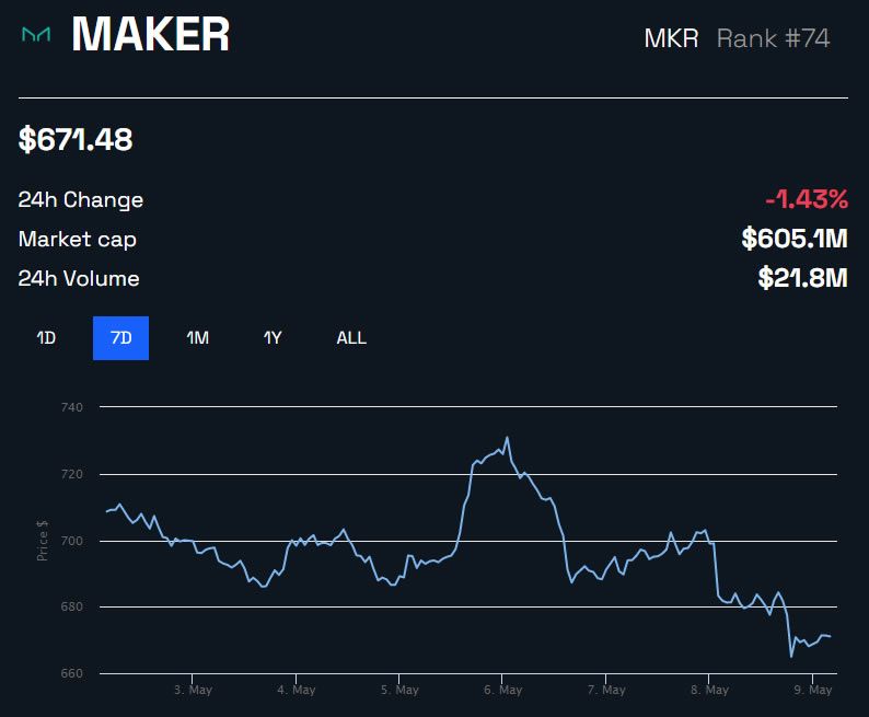 MakerDAO’s native token has dropped around 2% on the day in a fall to $671 as crypto markets retreat. MKR is currently trading at its lowest level for just over a month.