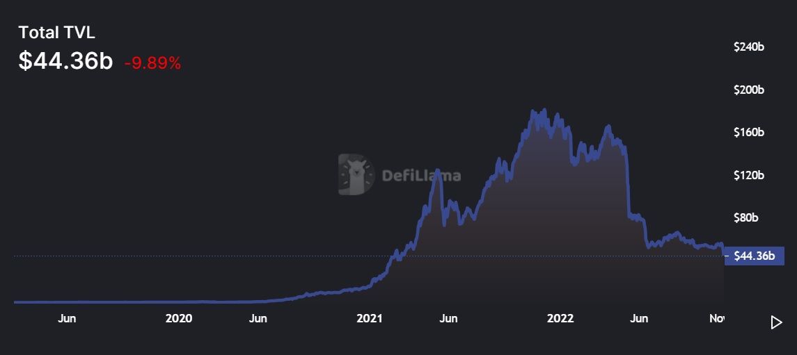 The DeFi market has seen its total value locked (TVL) drop by over 10% in the last 24 hours. The TVL is now $44.36 billion, a figure which last occurred in March 2021. The 20-month low is another sign that the crypto market is in a rough state following the collapse of FTX.
