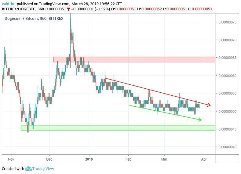 The price of Dogecoin on Bittrex is analyzed at six-hour intervals from Oct 25, 2018 to Mar 28, 2019 in order to better visualize possible reversal areas.