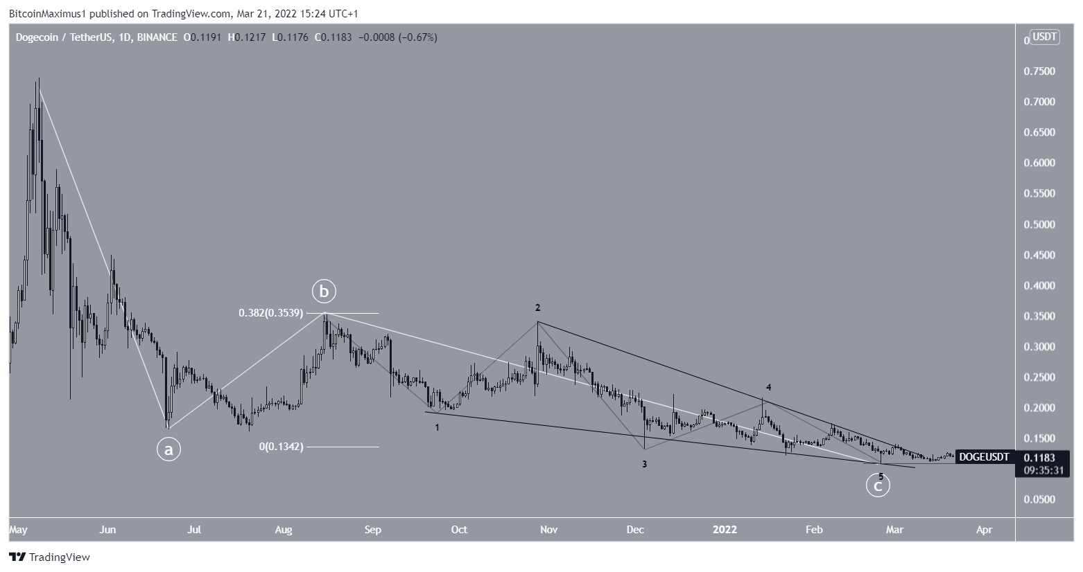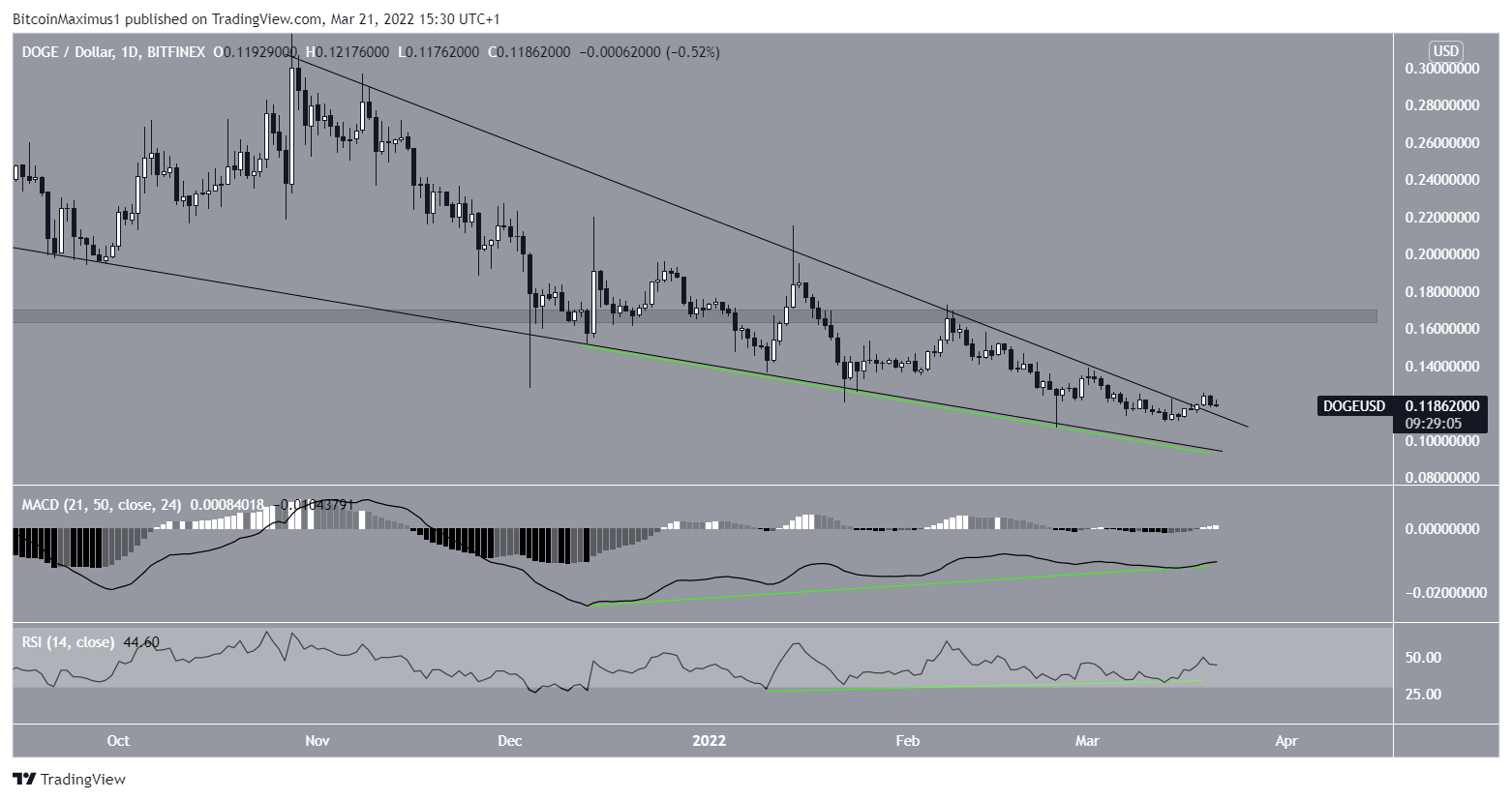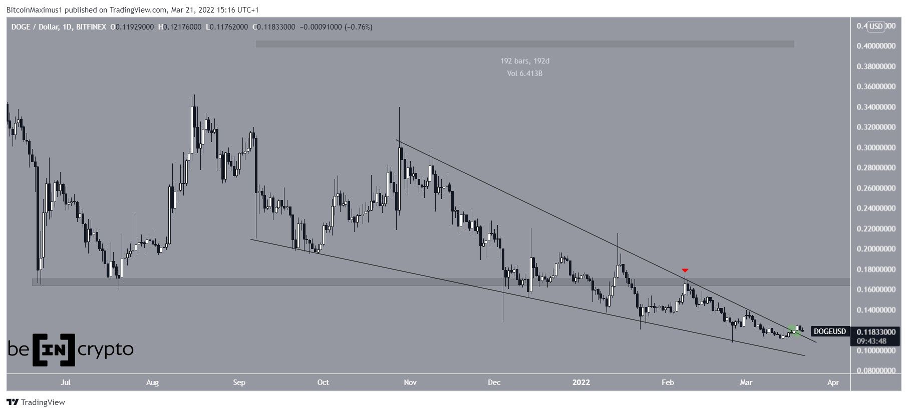 DOGE has been falling since reaching an all-time high on May 8, 2021. Since Sept 7 of the same year, it has been decreasing inside a descending wedge. The descending wedge is considered a bullish pattern, meaning that an eventual breakout from it would be the most likely scenario.Â