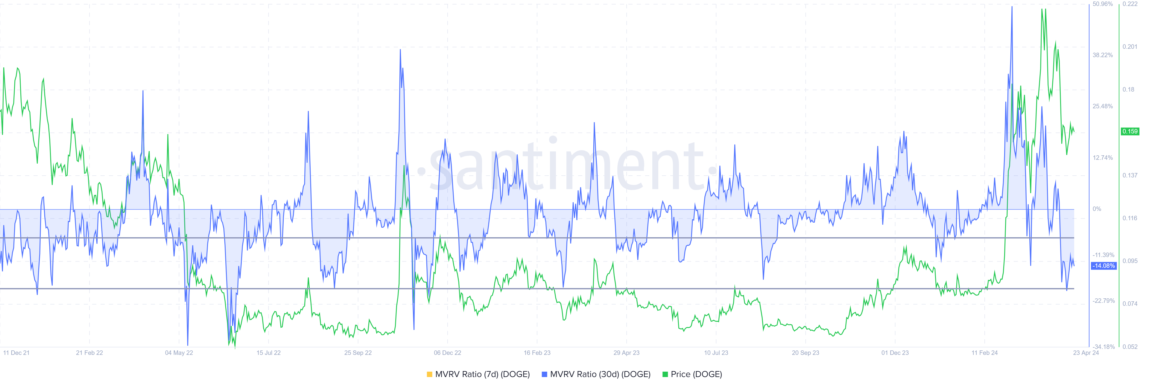 SponsoredBut this is also a bullish signal since values between -7% and -19% signal restraint against selling. DOGE holders would prefer to accumulate at such low prices to make a profit in the future. Consequently, Dogecoin’s price will also grow, labeling this area the opportunity zone.