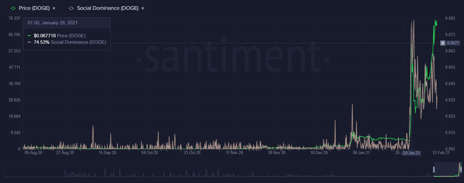 On Jan. 29, Dogecoin’s social dominance peaked at 74%. This value shows massive growth considering that DOGE rarely recorded a value over 10% since 2019.