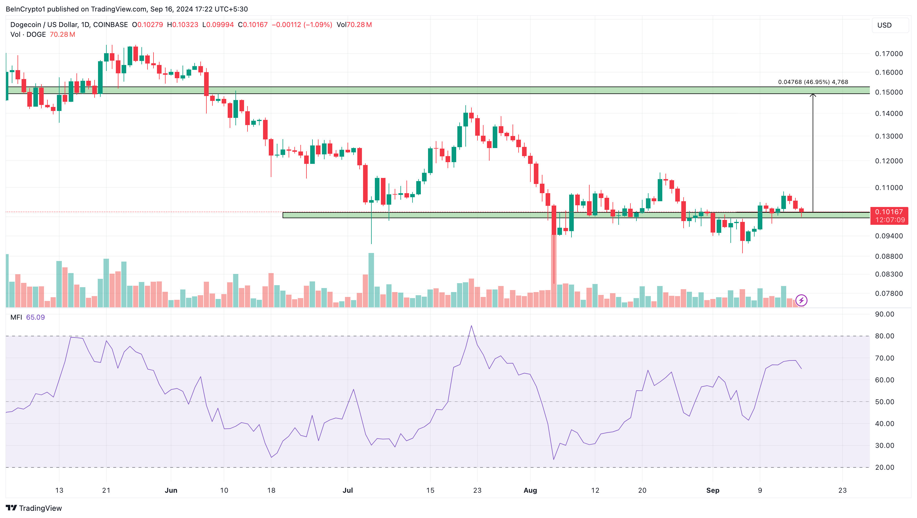 If this trend holds, DOGE could rally by nearly 50% to reach $0.15. However, if the coin breaks below its support, the bullish outlook would be invalidated, potentially leading to a drop toward $0.091.