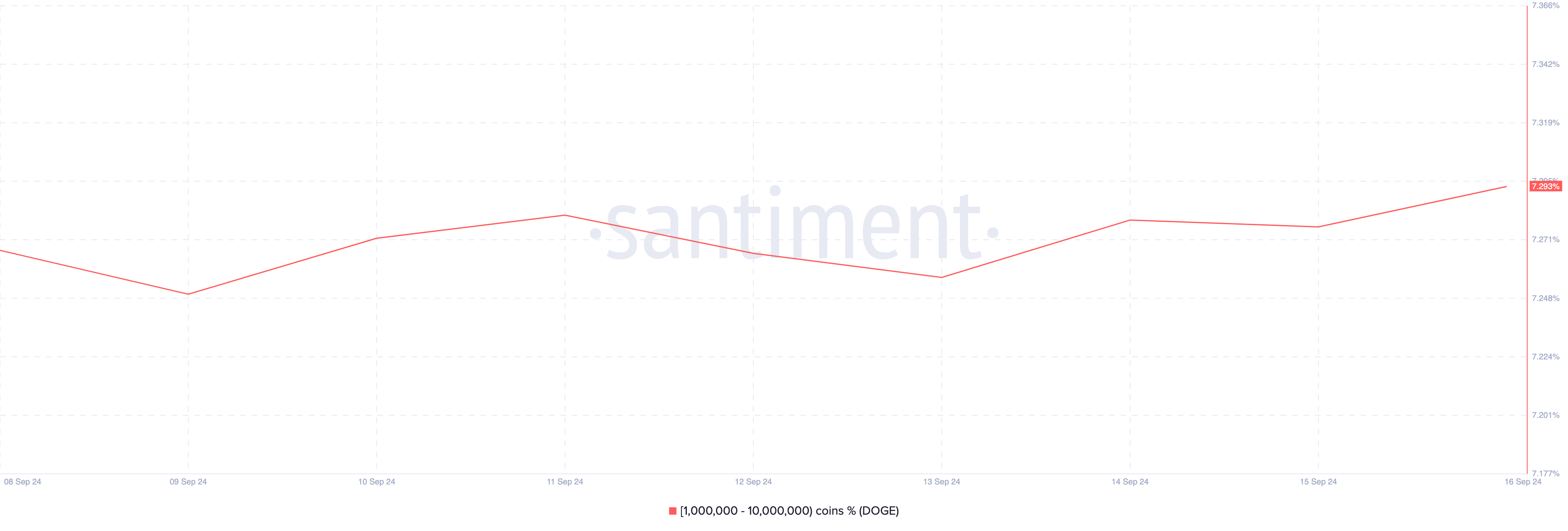 Furthermore, Santiment data shows an increase in the balance of addresses holding 1 million to 10 million Dogecoin coins. Typically, when this balance decreases, it indicates holders are selling off their assets.