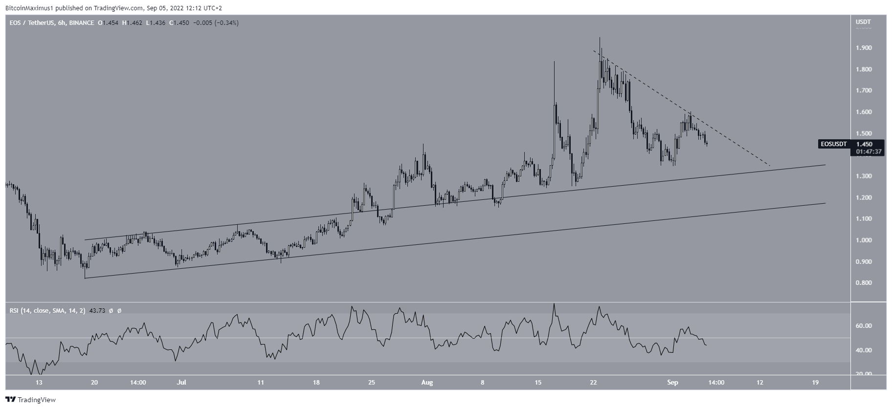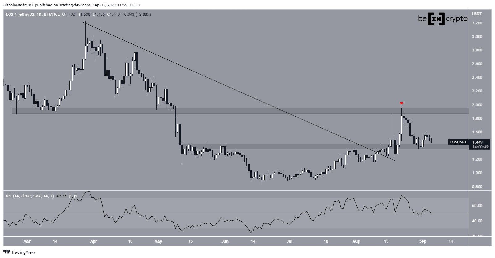 EOS has been moving upwards since June 18. After initially being rejected by a descending resistance line and the $1.40 horizontal resistance area, the price managed to break out on Aug 11. It proceeded to reach a high of $1.95 on Aug 22.Â