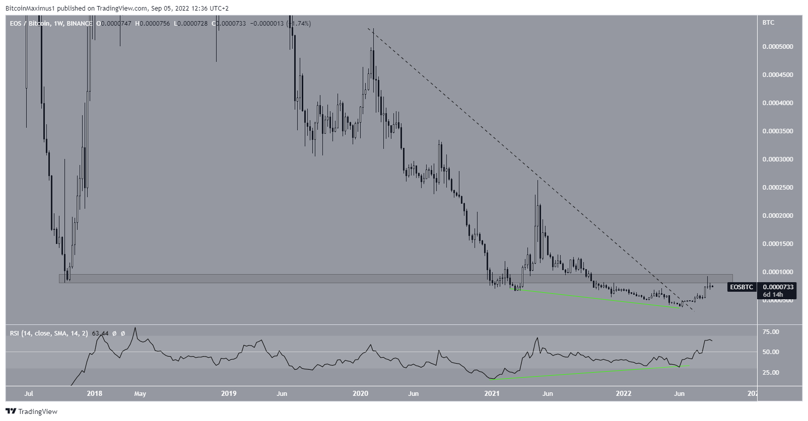 The EOS/BTC chart is more bullish than its USD counterpart. The main reason for this is the bullish divergence in the weekly RSI (green line) and the breakout from a long-term descending resistance line (dashed).Â