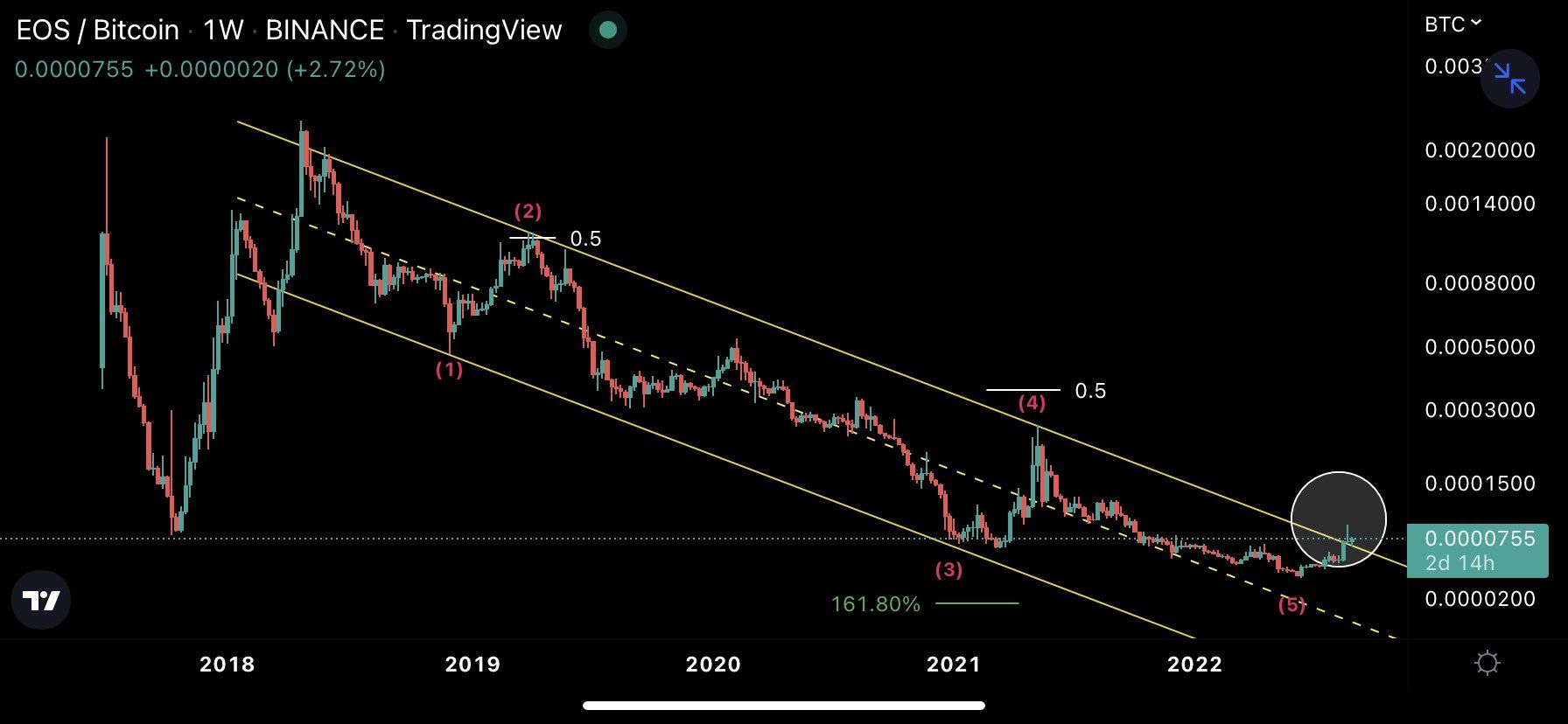Cryptocurrency trader @MesaWine1 tweeted a chart of EOS/BTC, stating that the price has completed a five-wave downward movement. If so, a new bullish trend has likely begun.