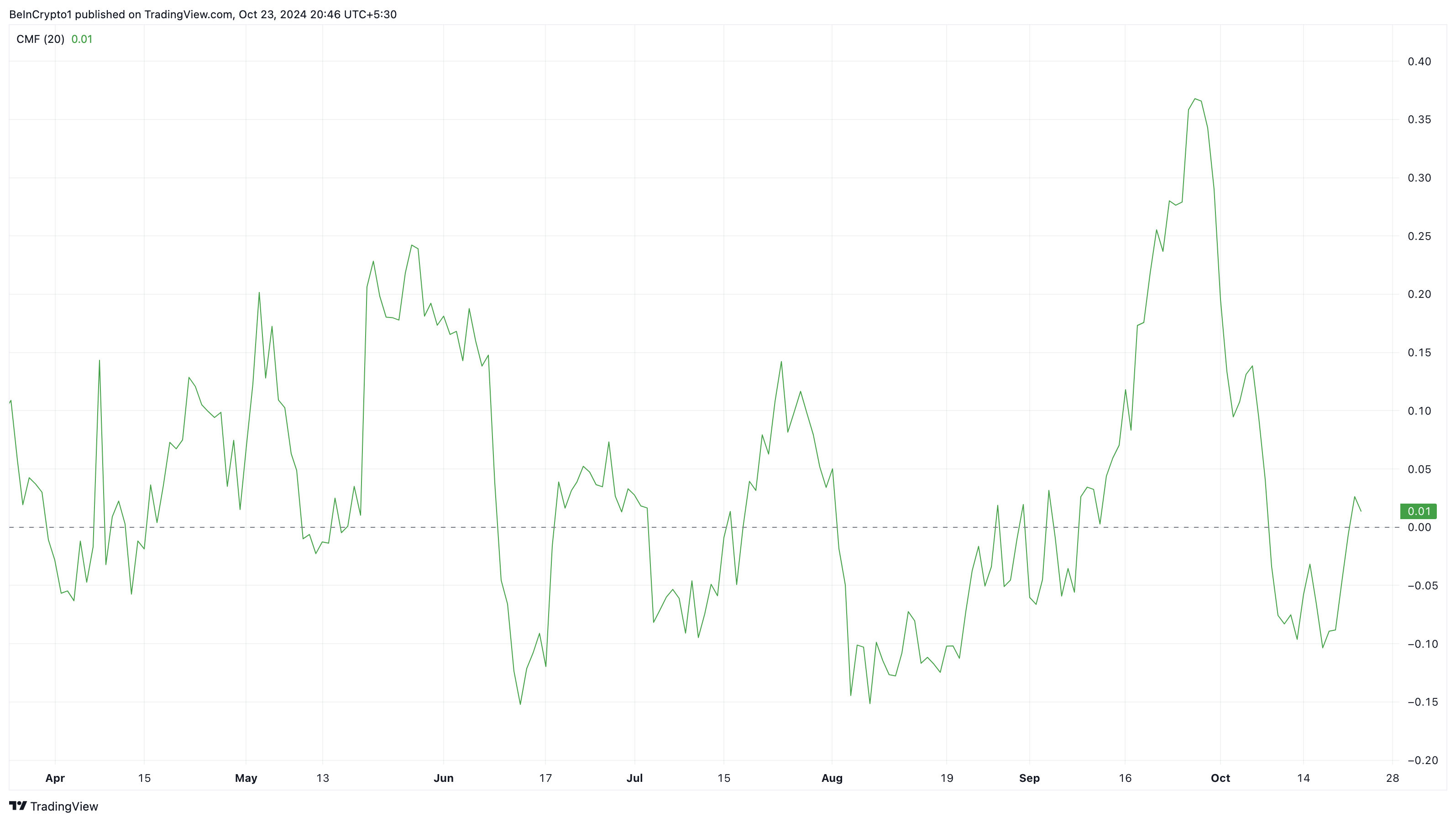 When the CMF rises, more money flows into the crypto involved. If sustained, this could drive a notable price increase. On the other hand, a negative CMF indicates that money is flowing out and holders are distributing.