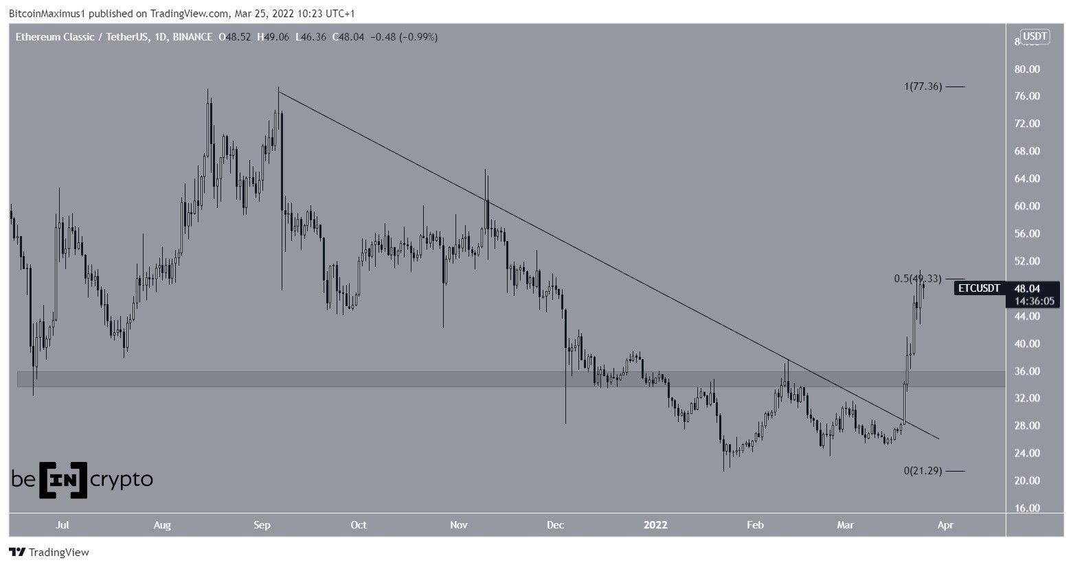 ETC has been moving upwards since and broke out from the resistance line on March 18. Two days later, it managed to reclaim the $35 horizontal area, which was a crucial resistance level.