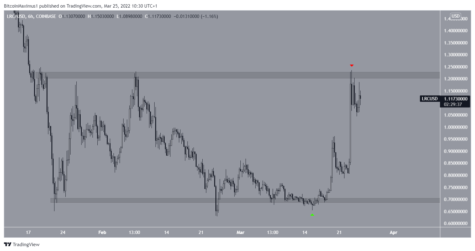 LRC has been trading in a range between $0.7 and $1.22 since Jan 20. More recently, it began an upward movement on March 15 (green icon) and reached the $1.22 resistance area on March 23 (red icon).
