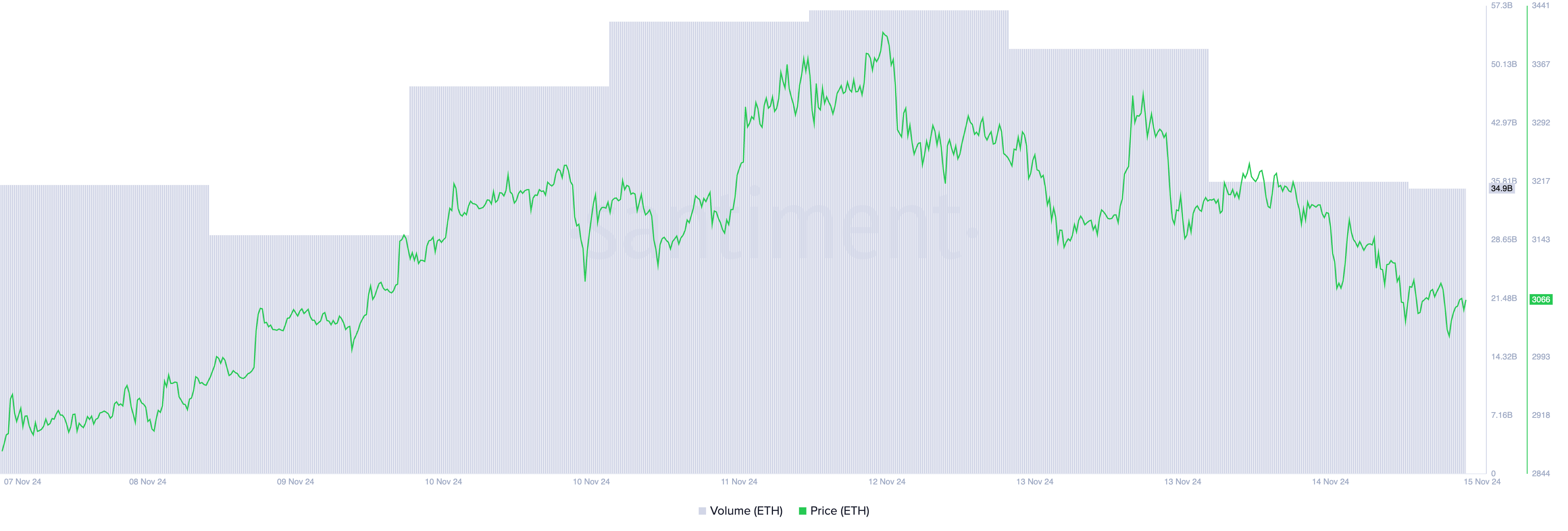 Ethereum’s (ETH) price peaked at $3,443 on Tuesday and has since witnessed a correction. It currently trades at $3,063 at press time, losing 3% of its value over the past 24 hours.