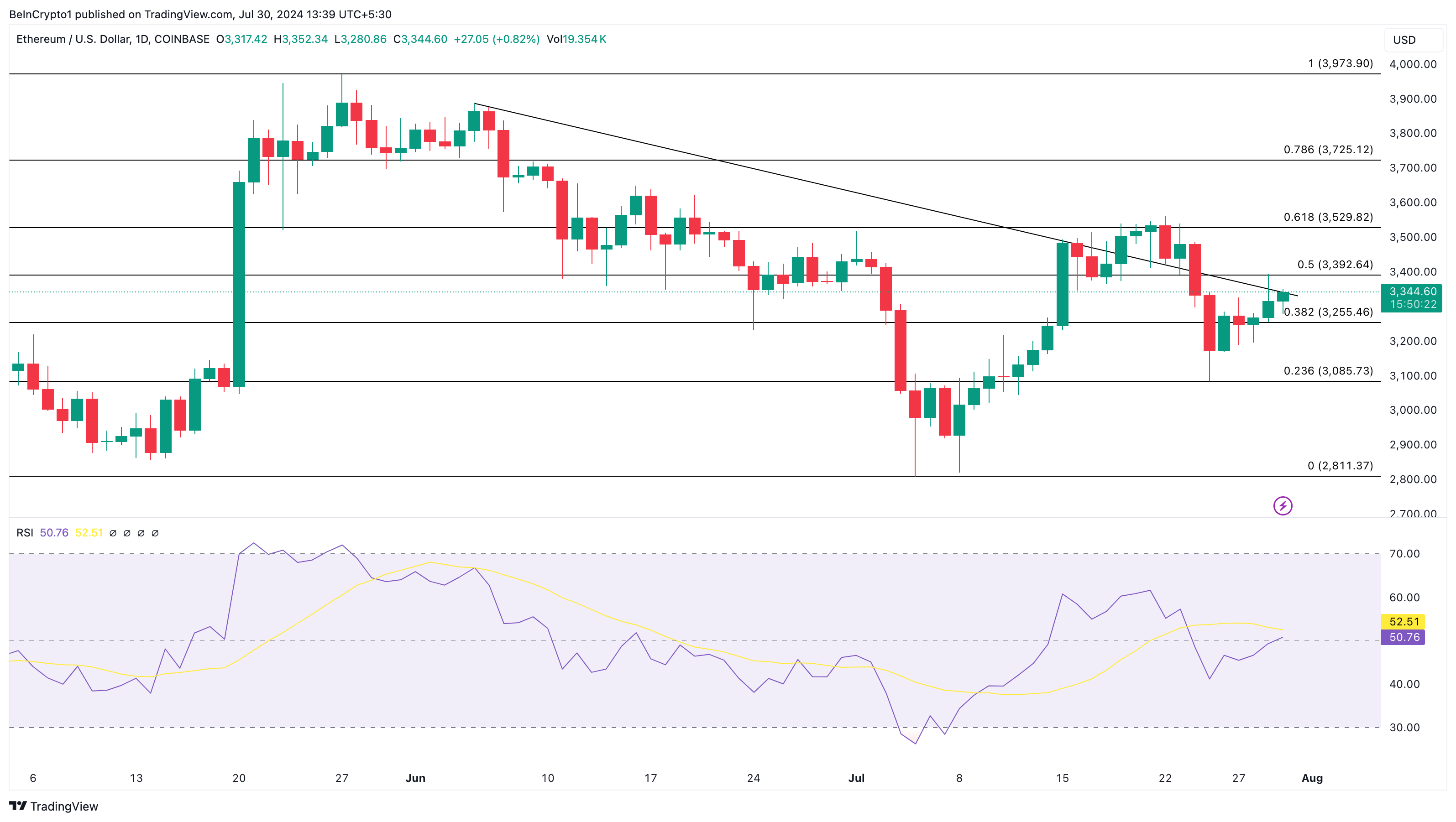 According to the daily chart, ETH seems ready to ride against the selling wave. This is because the price of the altcoin is close to breaking the descending trendlines on the daily chart. If this happens, the value of ETH could reach $3,392 and subsequently attempt to reach $3,529.