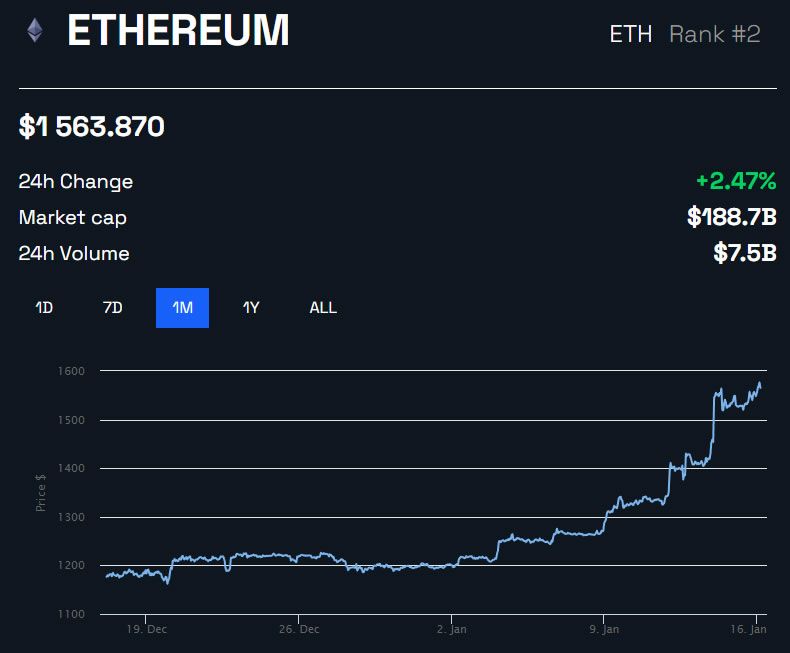 Ethereum prices closed in on $1,600 during the morning of Jan. 16. Building further on weekend gains, ETH tapped its highest price since Nov. 8, reaching $1,589 this morning.