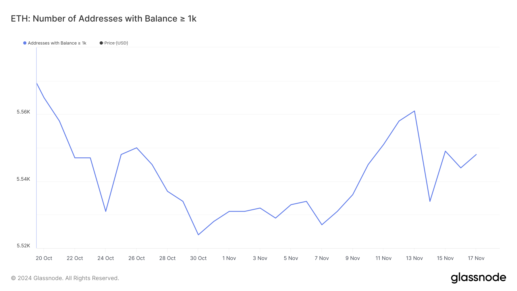 From November 7 to November 13, the number of whales holding at least 1,000 ETH increased significantly from 5,527 to 5,561. This marked one of the largest growth spurts in this metric for 2024, signaling strong accumulation by large holders.
