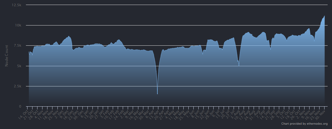 Data from Ethernodes shows that the number of network nodes has increased sharply from Nov. 16 to date.