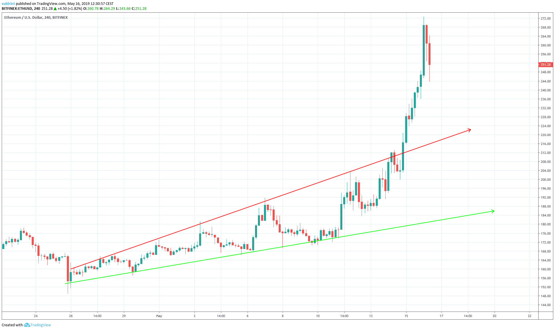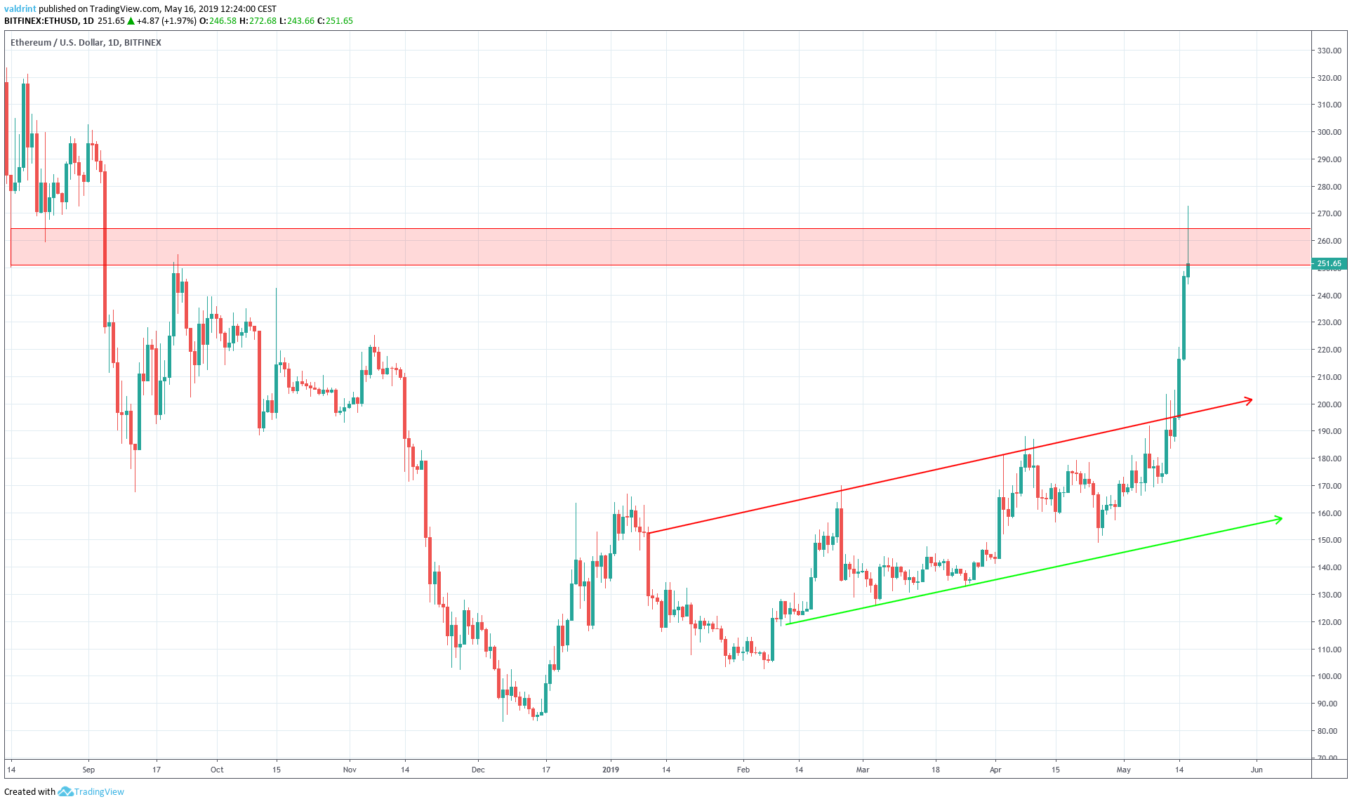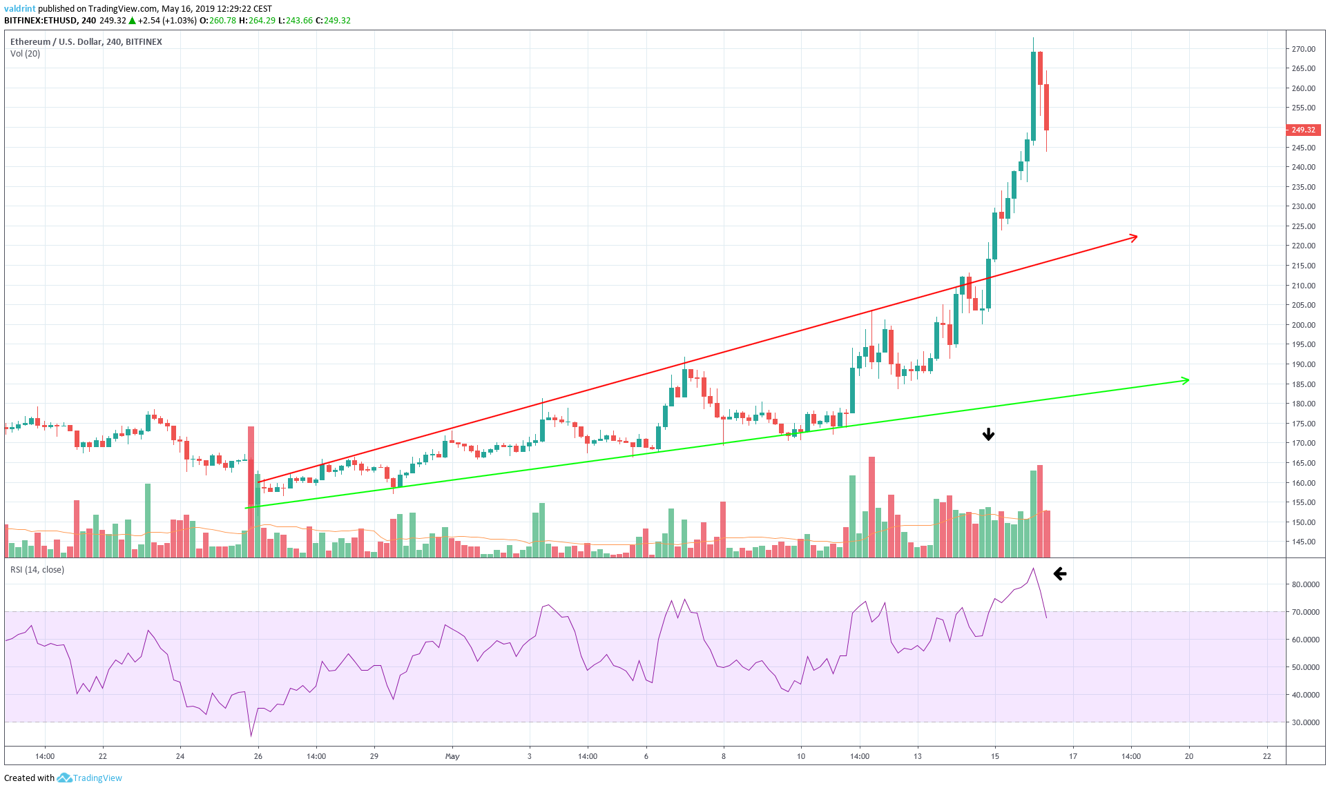 ETH traded within this wedge between Apr 27 and May 14. On May 14, the price broke out of the resistance line and has since been rising. It had broken past $270 at the time of rising.