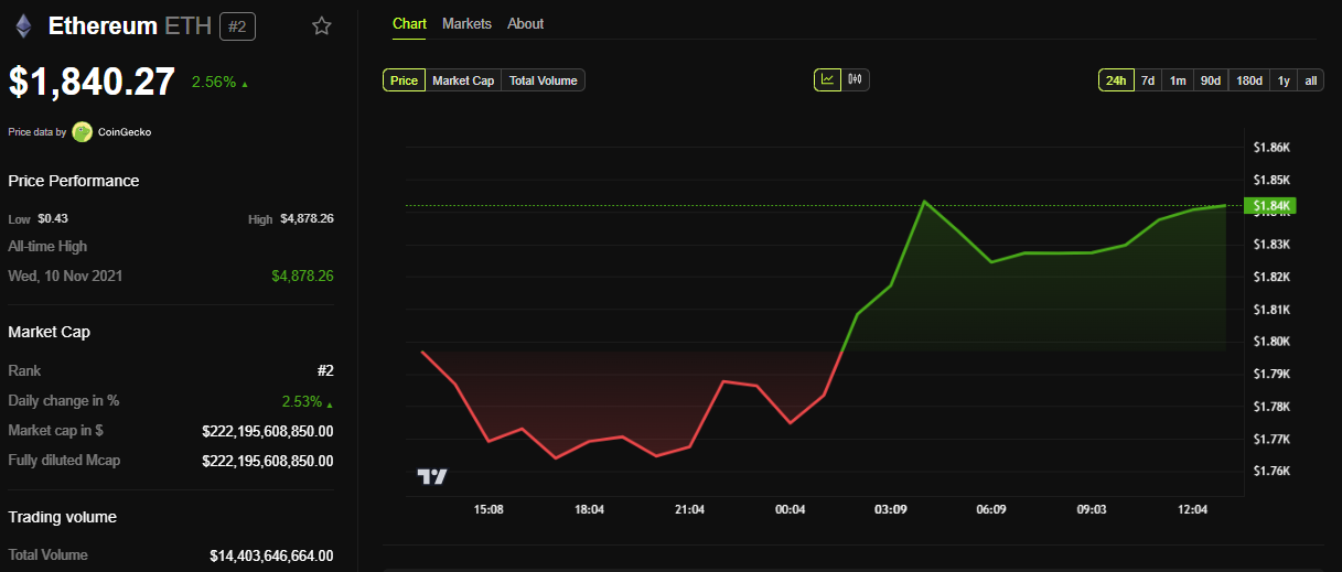 At press time, ETH trades around $1,840, up almost 3% over the last 24 hours, as markets digest the upgrade while bracing for today’s FOMC rate decision.