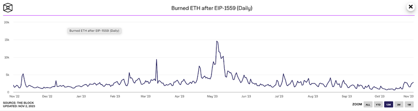 The chart above shows that 7,960 ETH worth approximately $15 million were destroyed between October 28 and November 1 alone. Notably, the 2,610 ETH (~$5 million) burned on Wednesday was the highest since August.