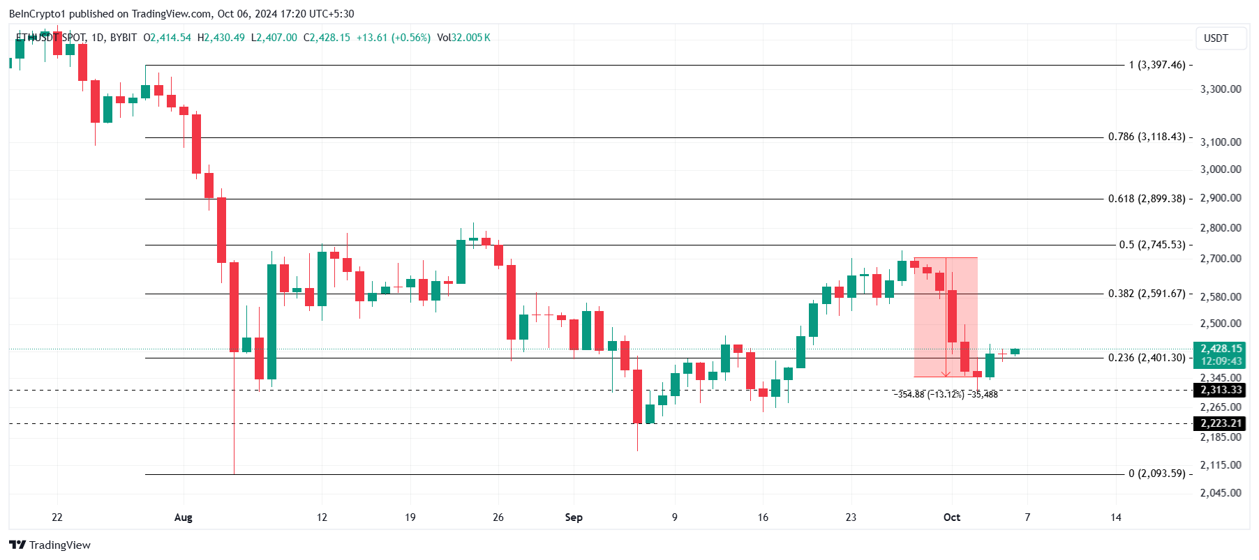 Ethereum’s price is currently trading at $2,428, recovering from its recent 13% decline. The cryptocurrency has successfully secured the 23.6% Fibonacci Retracement line at $2,401 as a support level, signaling a possible continuation of uptrend.