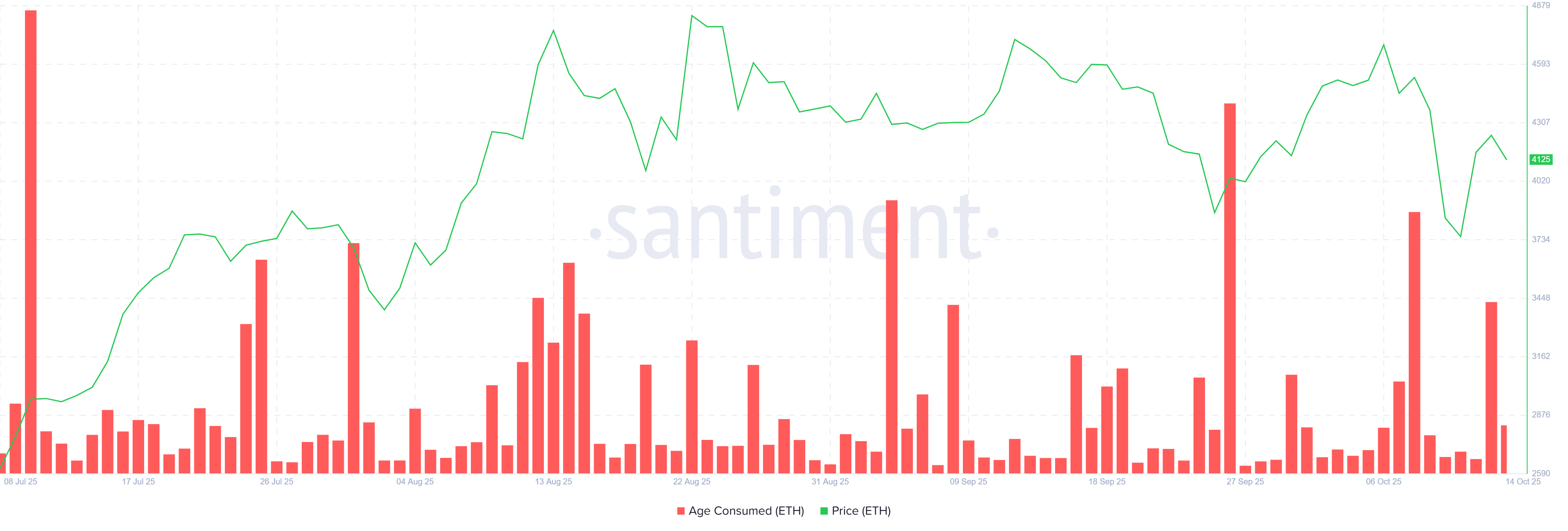 Ethereum’s “Age Consumed” metric has spiked twice this month, indicating a notable increase in long-term holder activity. This on-chain metric measures when previously dormant coins begin moving again, often signaling that older holders are selling. Repeated spikes suggest that confidence among long-term investors may be weakening.