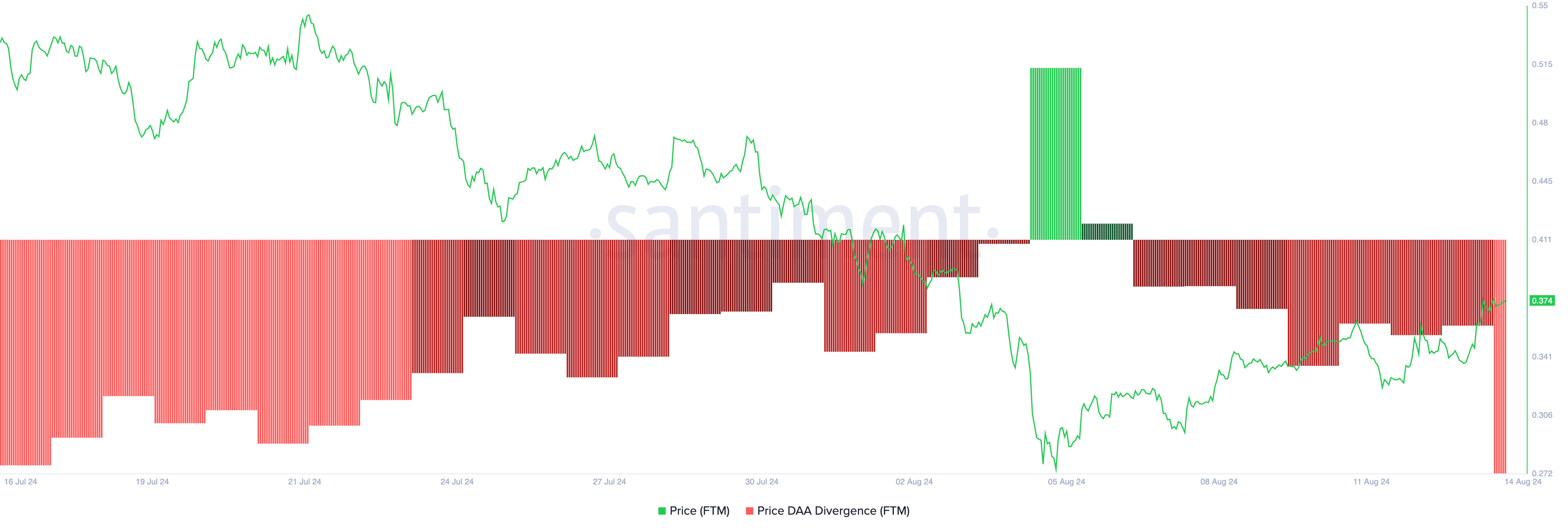 An asset’s price DAA divergence compares its price movements with the changes in its number of daily active addresses. It tracks whether an asset’s price movement is supported by corresponding network activity.