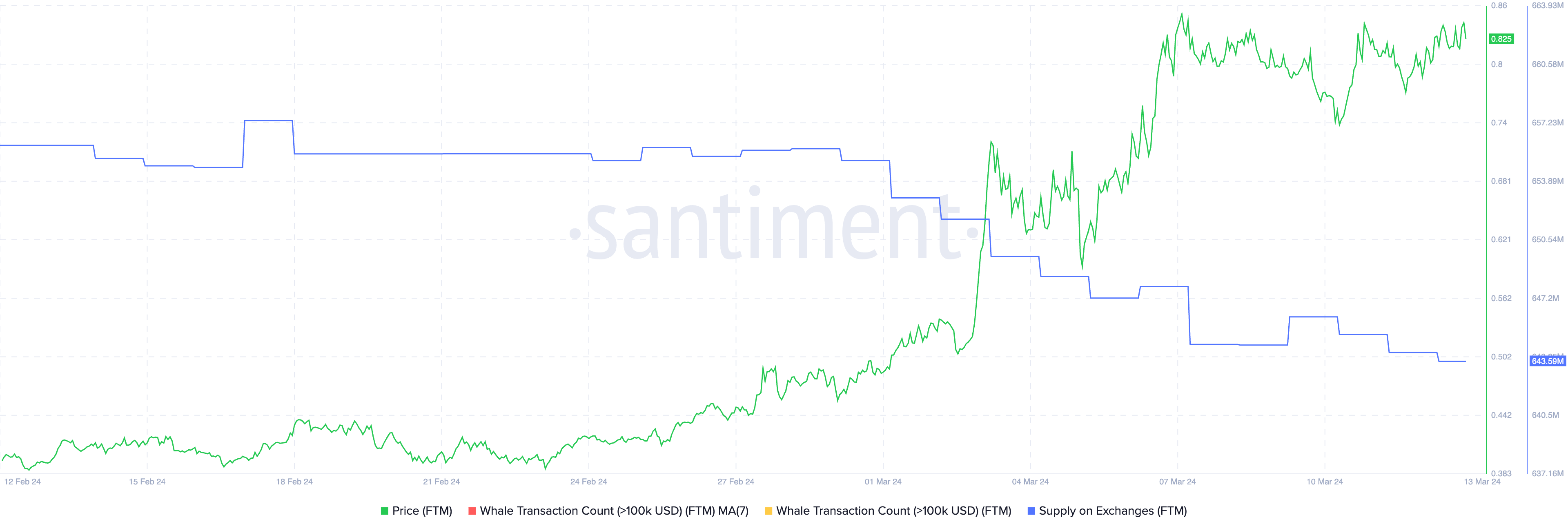 Since March 1, the quantity of FTM tokens available on exchanges has notably decreased from 655 million to 643 million. This trend seems to be closely associated with a significant uptick in the value of Fantom’s price, which escalated from $0.50 to $0.82 within a span of just 12 days, marking an impressive 64% growth in value.
