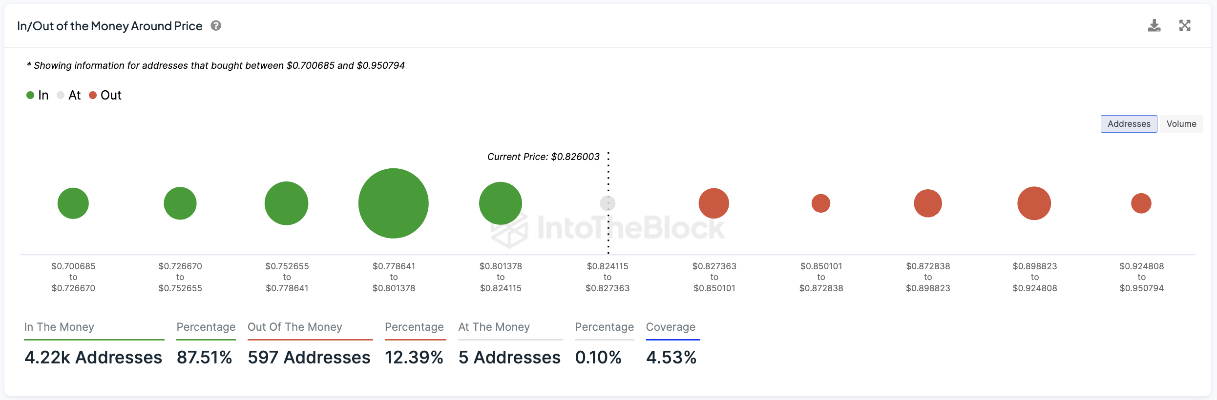 The In/Out of the Money Around Price (IOMAP) analysis for FTM indicates that most holders, precisely 87.51% or 4,220 addresses, find themselves in a favorable financial position, having acquired FTM at prices below the current $0.82 mark. This significant portion of investors holding onto profits is poised to act as a foundational support for FTM price.
