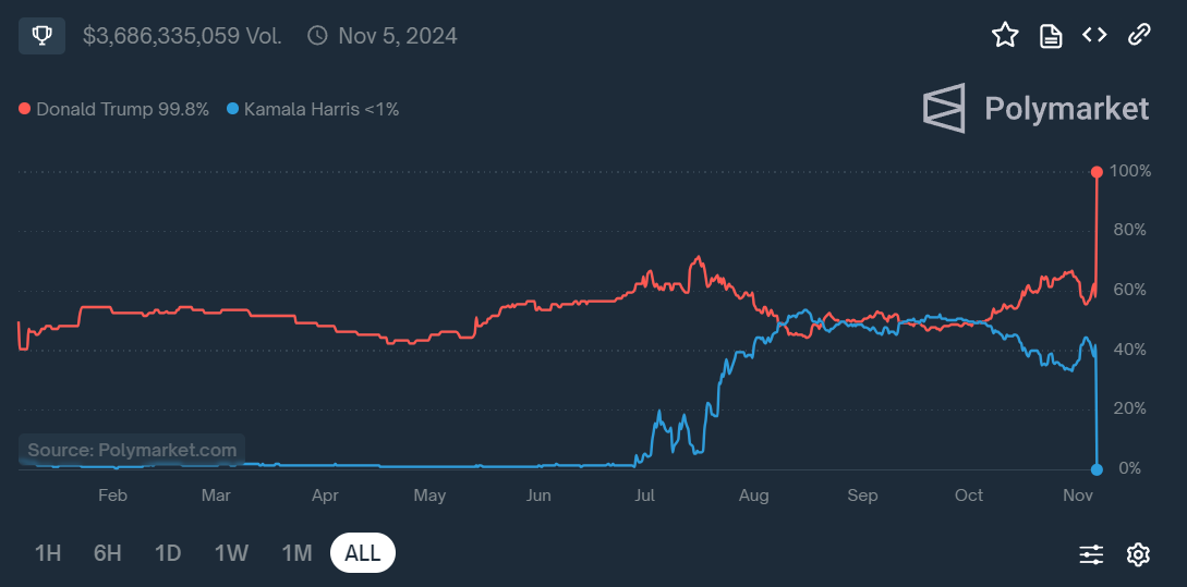 Crypto betting saw surging interest and user engagement ahead of the 2024 US election. Polymarket’s trading volume exceeded $3 billion before November 5, with Trump holding a 58.3% probability of winning.