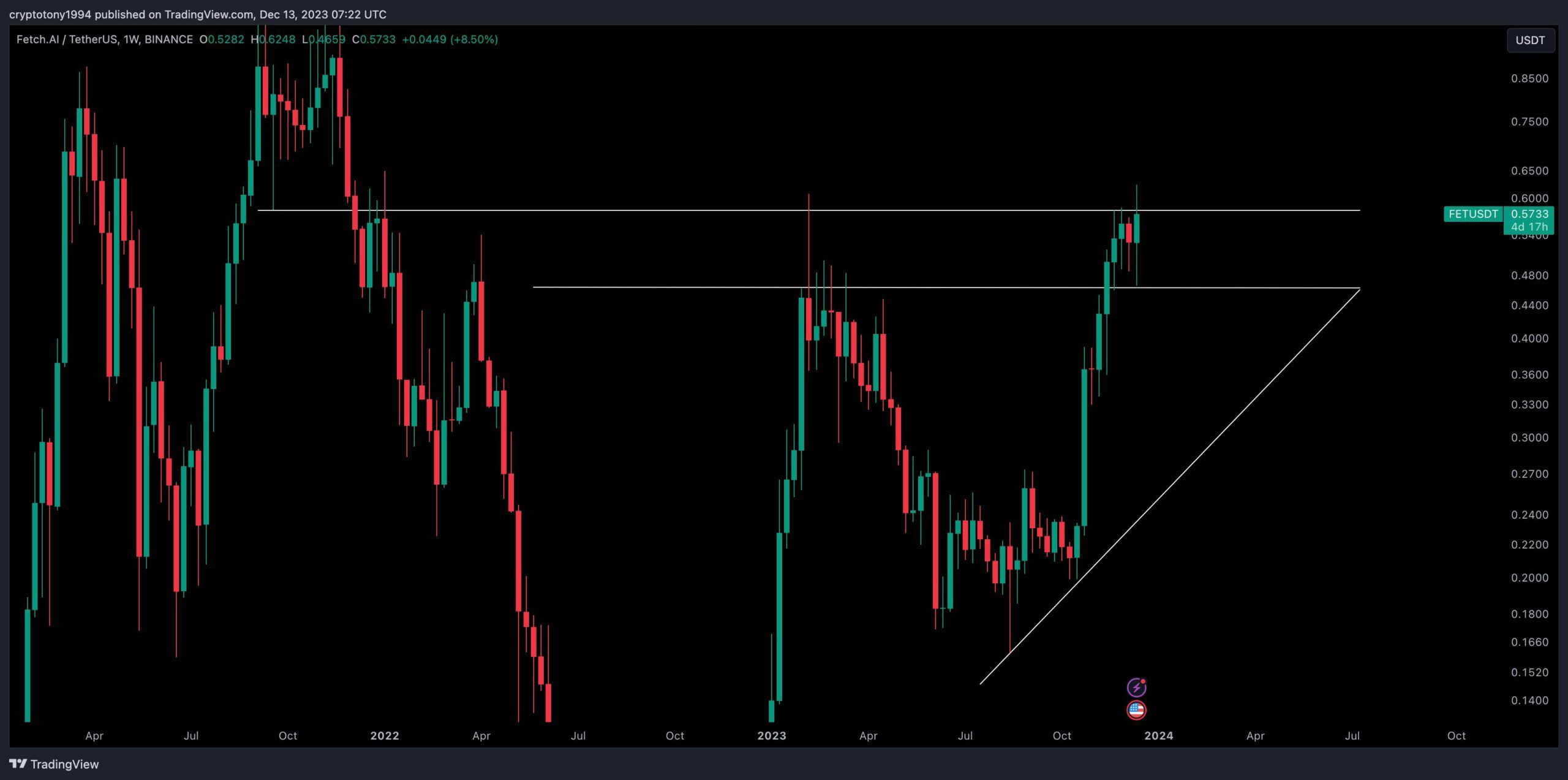 The Fetch.ai (FET) price increased by nearly 25% yesterday and reached a new yearly high of $0.62 today before falling slightly.