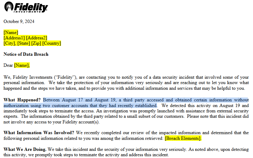 Fidelity’s “Notice of Data Breach” Sample Letter. Source: Maine’s attorney general
