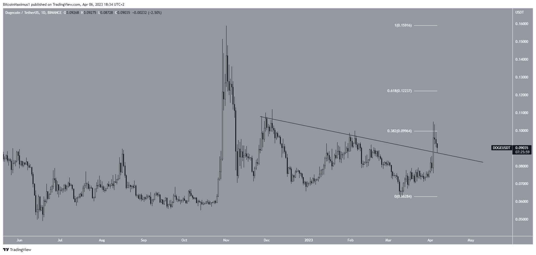 Dogecoin is another of the top bullish cryptos of the week that saw its price broke out from a descending resistance line on April 3. However, it was rejected by the 0.382 Fib retracement resistance level at $0.10.