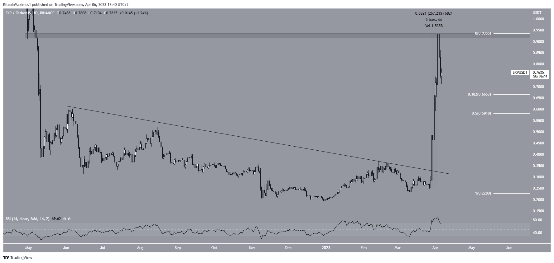 SXP is one of the bullish cryptos that saw its price increase rapidly since breaking out from a descending resistance line on March 29. The breakout led to a high of $0.94 on April 3.