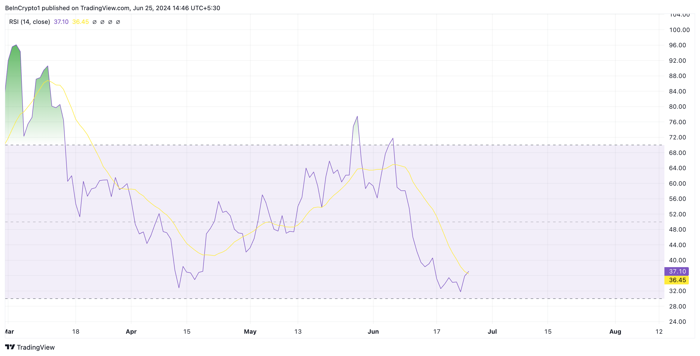 This indicator measures overbought and oversold conditions in the meme coin market. Its range is from 0 to 100, with values above 70 indicating that the token is overbought and likely due for a correction. Values below 30 suggest the asset is oversold and poised for a rebound.