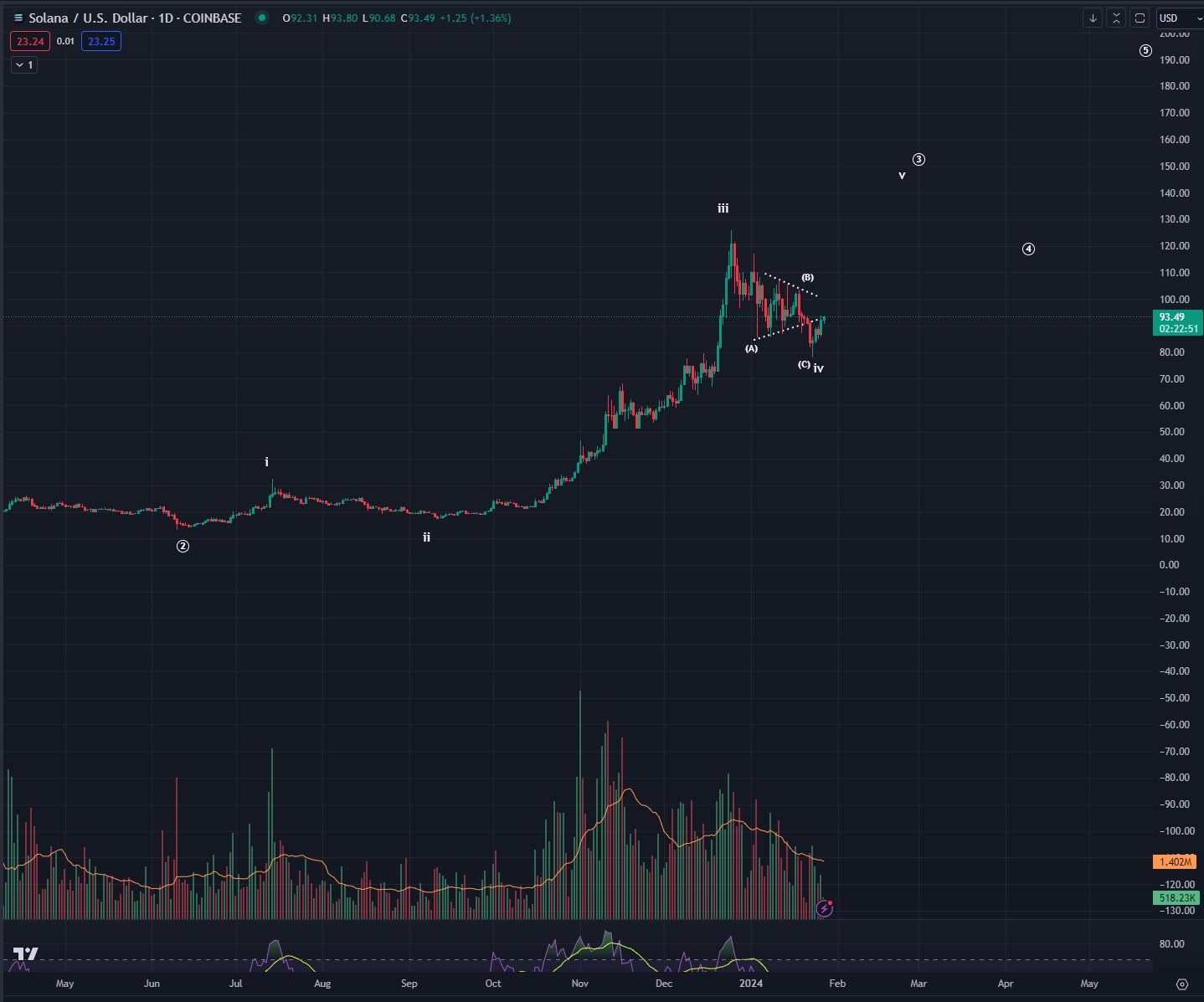The wave count suggests that the SOL price is in wave four in a five-wave upward movement. However, it does not confirm whether wave four is complete or not.