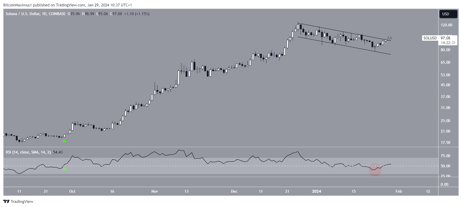 The technical analysis of the daily time frame shows that SOL has fallen since reaching its 2023 high of $126 on December 25. The decrease has been contained inside a descending parallel channel and led to a low of $78 on January 23, 2024.