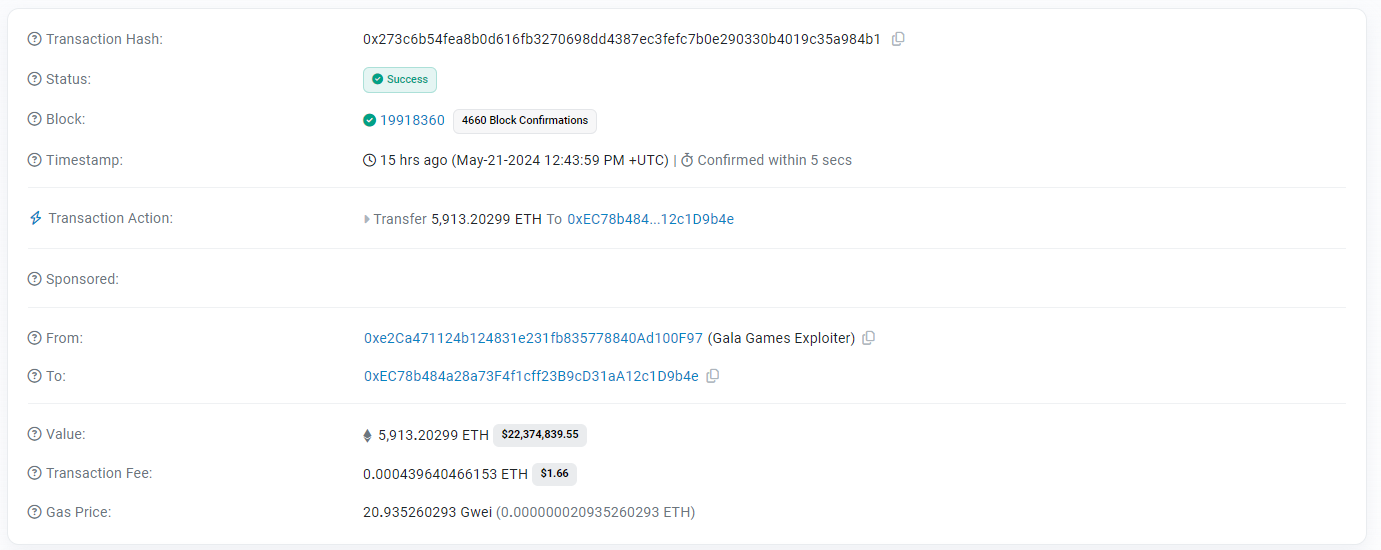 Jason Brink, President of Blockchain at Gala Games, shared a link to the on-chain data of the stolen fund return transaction. According to the data, the address labeled as Gala Games Exploiter has returned 5,913 ETH, worth approximately $22.37 million with the current price.