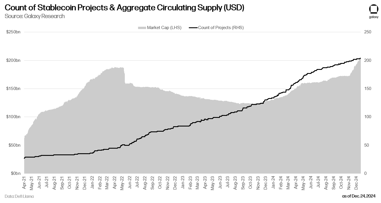 Galaxy Research predicts a dynamic shift in the stablecoin sector. The report expects the total stablecoin supply to surpass $400 billion by 2025, with at least ten new stablecoin projects backed by traditional finance partnerships entering the market. These developments will expand the use of stablecoins for payments, remittances, and settlements.